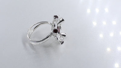 Celebrate your bold side with this handcrafted sterling silver floral ring, designed to make a statement. The ring features a large, deep red garnet at its center, surrounded by petal-like structures that resemble a blooming flower. Each petal is topped with a smaller garnet, giving the ring a vibrant and luxurious look.
