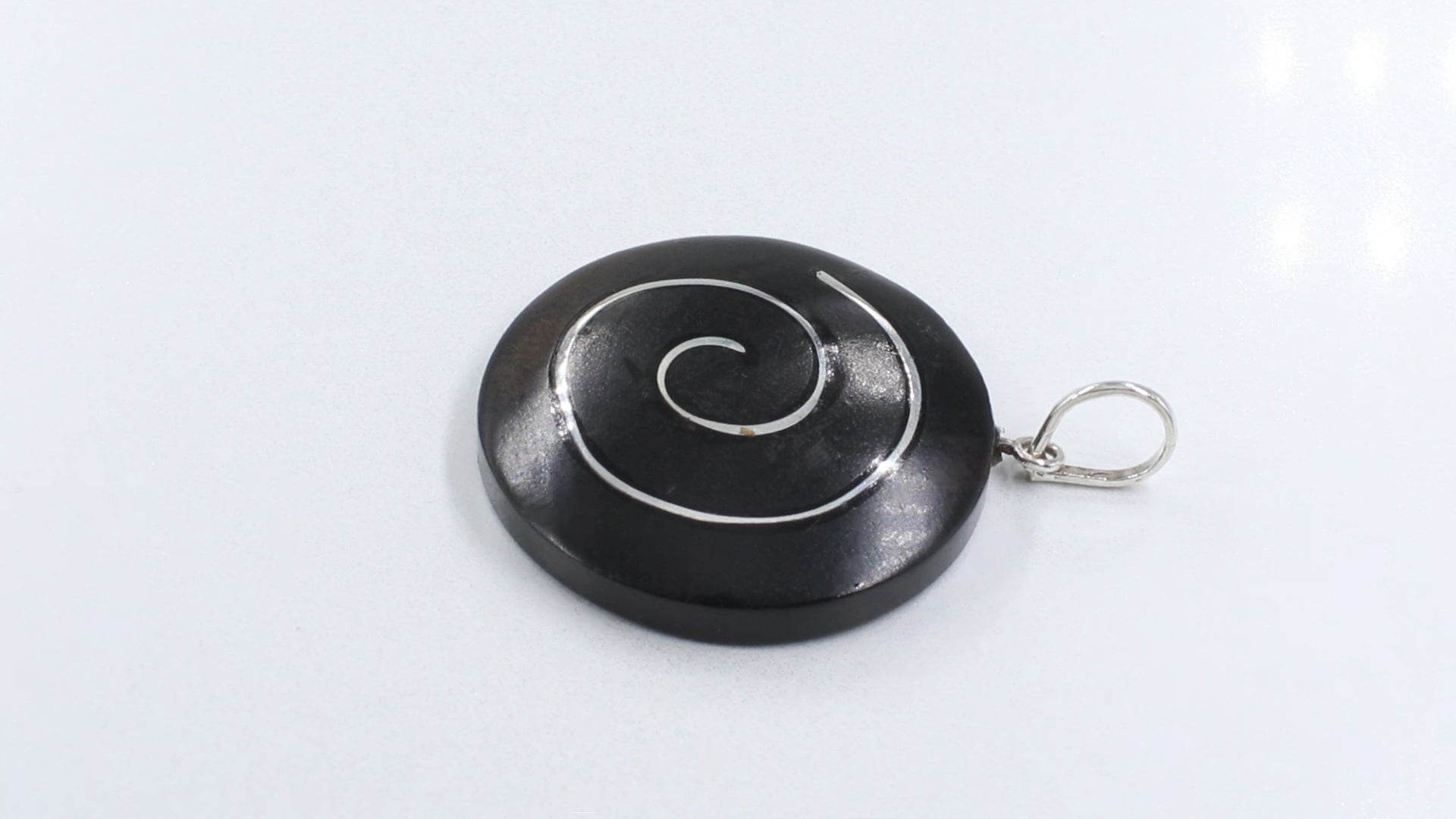 The reverse side of the pendant is equally striking, featuring a mirror image of the spiral design. The mirrored pattern creates a sense of symmetry and balance, adding depth and visual interest to the overall design.