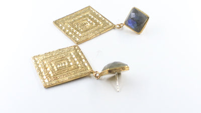 Brass Labradorite Stud Earrings with Hammered Texture Engraving