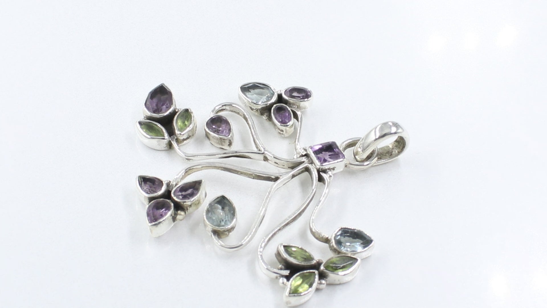 The pendant typically features several different gemstones, which may include a variety of stones such as amethyst, garnet, peridot, topaz, citrine, and others. These gemstones are often chosen for their diverse colors, which can range from deep blues and purples to bright reds, greens, and yellows. The gemstones may be arranged in a pattern, cluster, or specific design that highlights their individual hues and characteristics.